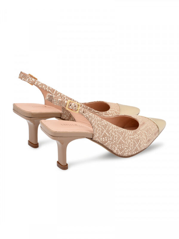 Opis: Kožne ženske sandale u metalik bež i zlatnom printu sa otvorenom petom i potpeticom visine 6,5 cmOdaberi opcije This product has multiple variants. The options may be chosen on the product page -