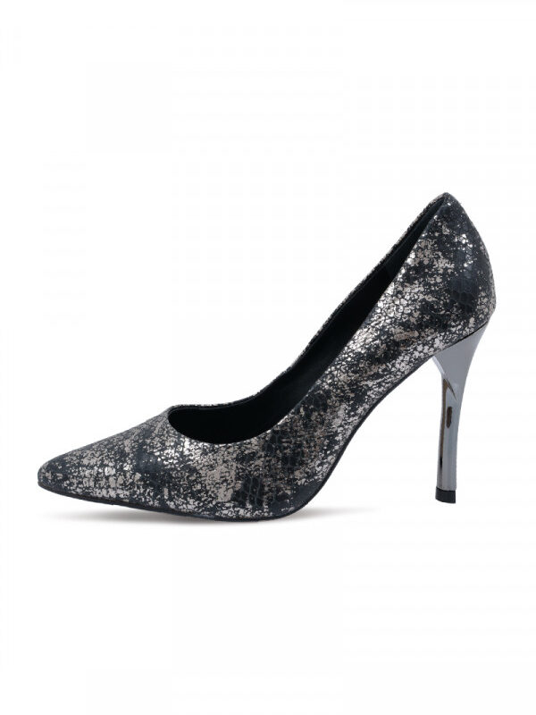 Opis: Elegantne ženske cipele od kroko kože u crnoj boji sa srebrnim detaljima, špicastim vrhom i visokom potpeticomOdaberi opcije This product has multiple variants. The options may be chosen on the product page