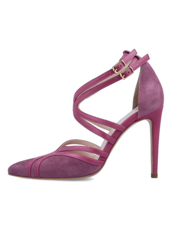 Opis: Kožne ženske sandale sa kaiševima u lila boji i potpeticom visine 12 cm
