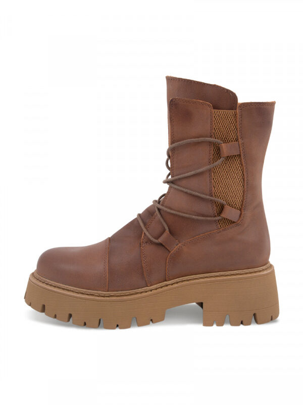 Opis: Kožne ženske poluduboke čizme u boji konjaka sa visokim đonom i lastiš trakamaOdaberi opcije This product has multiple variants. The options may be chosen on the product page -