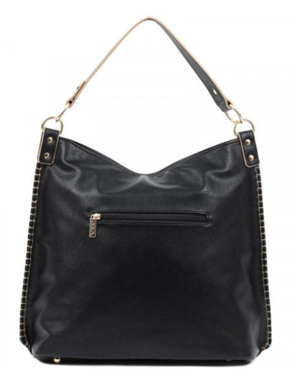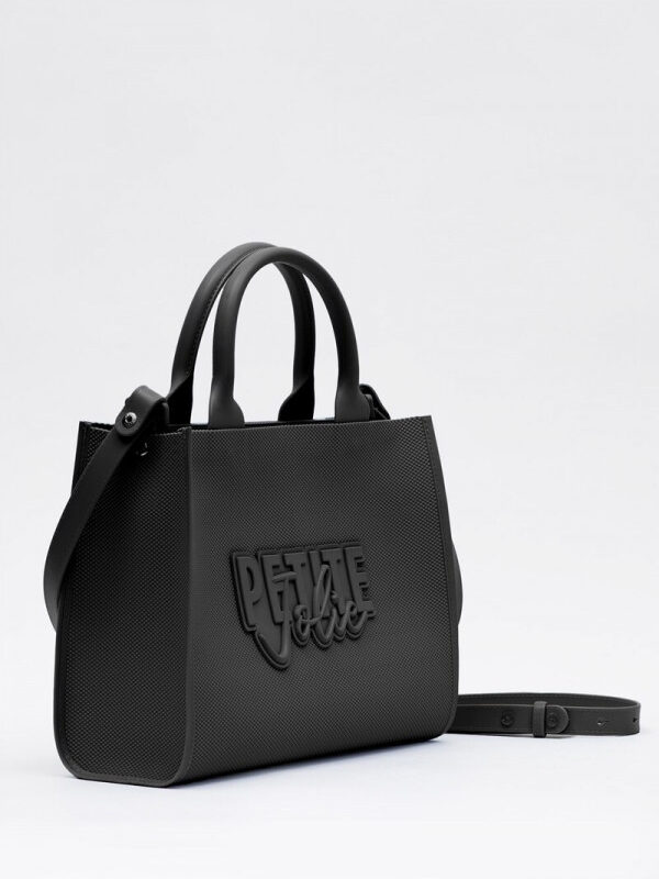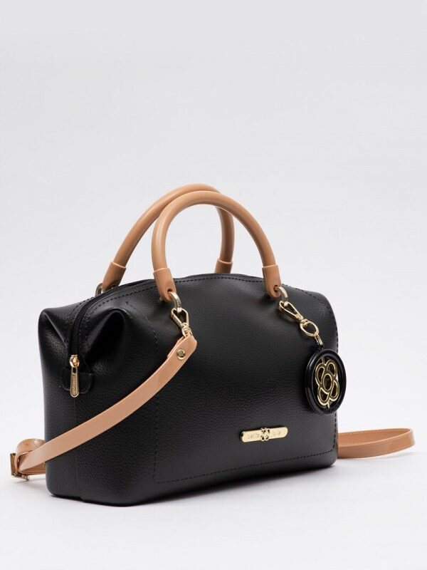 Sastav: Veštački materijalOpis: Gumena ženska torba u crnoj boji sa metalik zlatnim detaljima i logo znakom