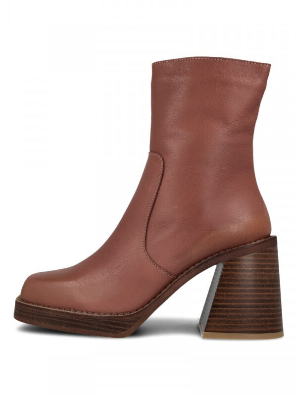 Opis: Kožne ženske čizme u tamno bež boji saneobičnom geometrijskom potpeticom visine 10 cm