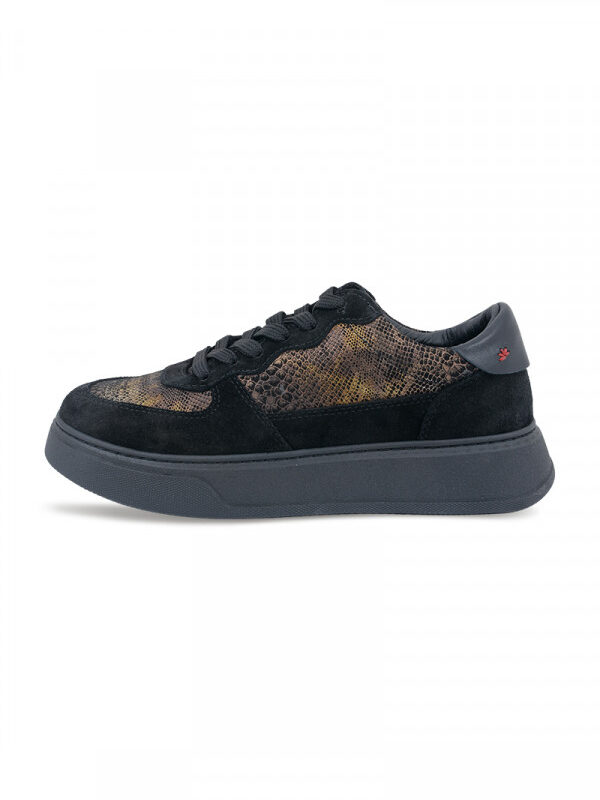 Opis: Kožne ženske plitke patike u crnoj boji sa izdignutim đonom i animal print detaljimaOdaberi opcije This product has multiple variants. The options may be chosen on the product page -