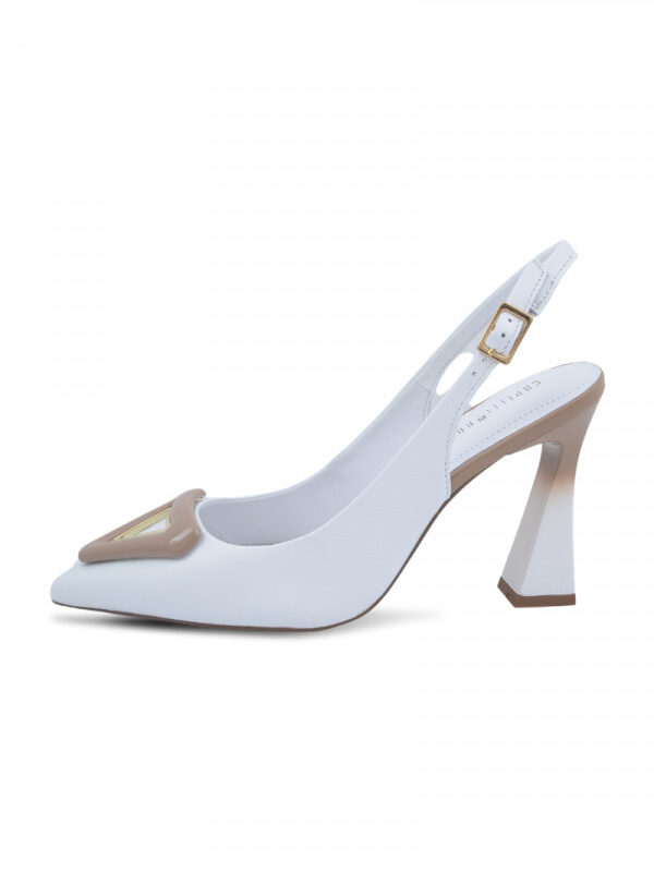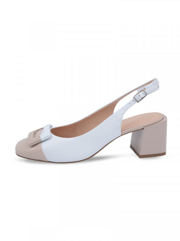 Opis: Kožne ženske sandal eu kombinaciji puder i bele boje sa šnalom, otvorenom petom i četvrtastom potpeticomOdaberi opcije This product has multiple variants. The options may be chosen on the product page -