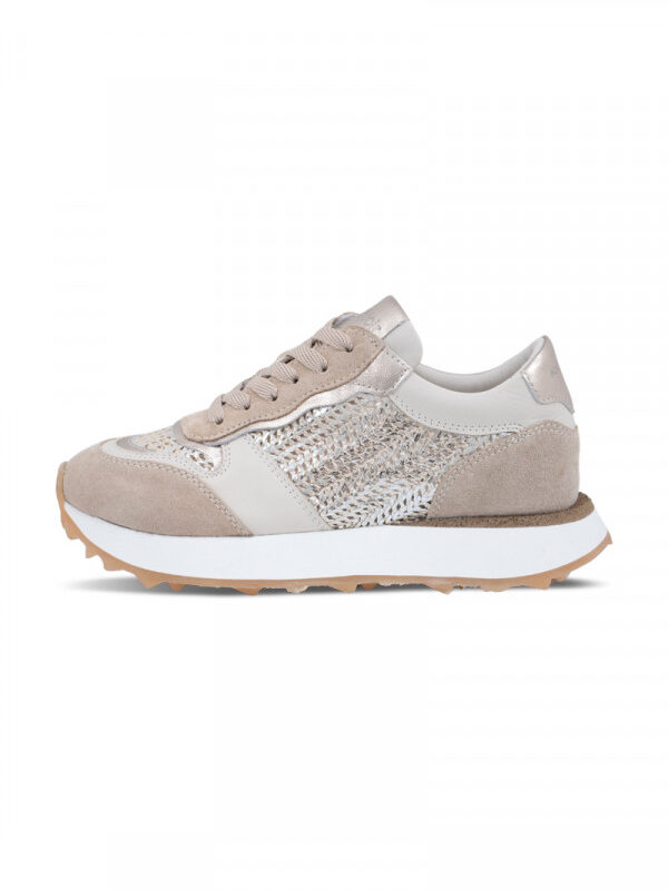 Opis: Ove moderne ženske patike brenda Noa Noir u taupe i bež tonovima predstavljaju savršen spoj sportske funkcionalnosti i luksuznih detalja. Sa izdignutim đonom i bogatom teksturom, idealne su za dame koje žele da dodaju notu glamura svom svakodnevnom stilu. Bočne strane krase specifični pleteni detalji i metalik srebrni umetci koji reflektuju svetlost. Postavljena unutrašnjost i mekani jezik osiguravaju komfor tokom celodnevnog nošenja, dok izdignuta peta pruža dodatnu potporu. Savršene su za “lifestyle” kombinacije-od sportskih trenerki do “smart-casual” izdanja sa blejzerom i farmerkama.Odaberi opcije This product has multiple variants. The options may be chosen on the product page -