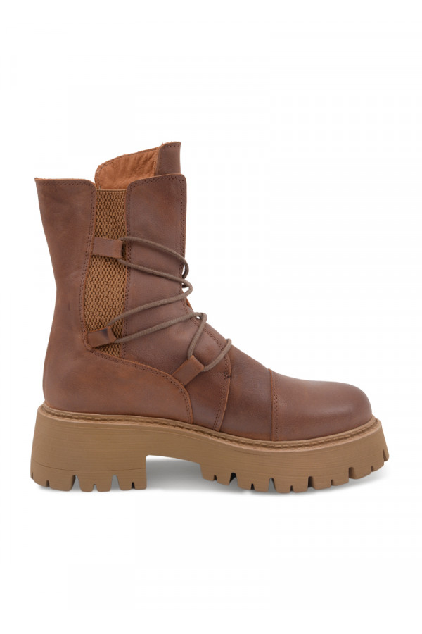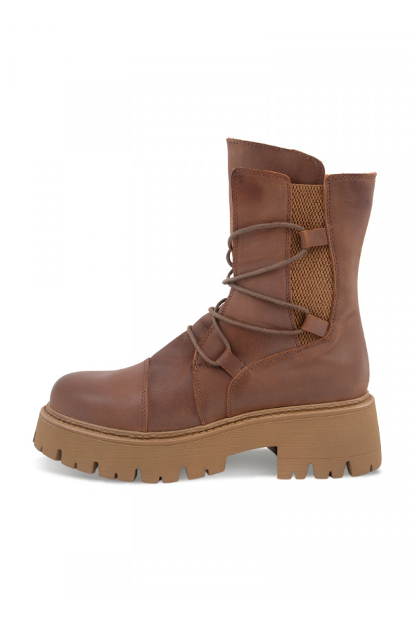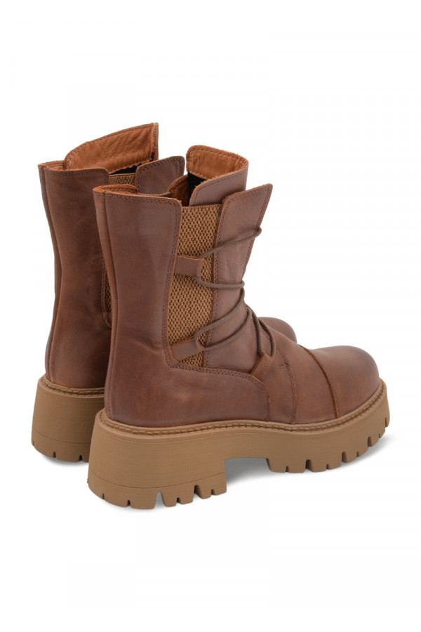 Opis: Kožne ženske poluduboke čizme u boji konjaka sa visokim đonom i lastiš trakama