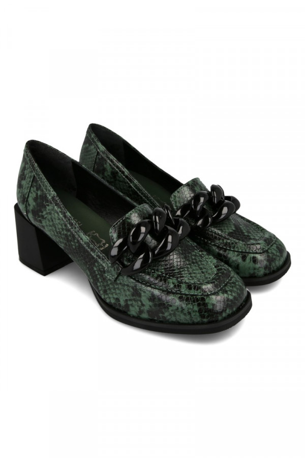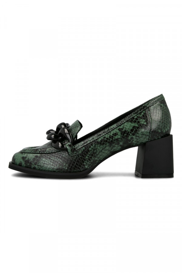 Opis: Kožne ženske cipele u animal printu tamno zelene boje sa dekorativnim lancem i širokom potpeticom visine 5,5 cm