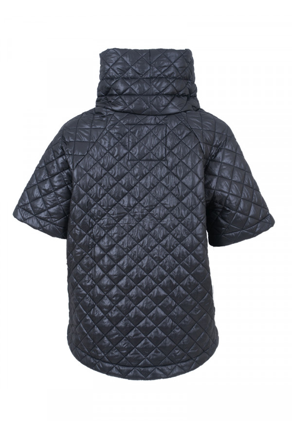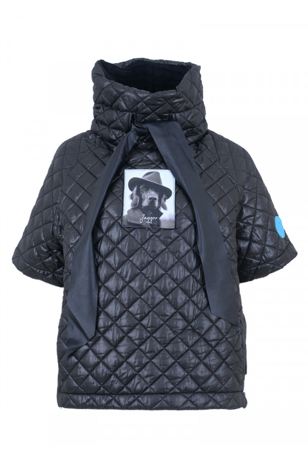 Opis: Ženska štepana jakna u crnoj boji sa kratkim rukavima, visokom kragnom i print aplikacijom