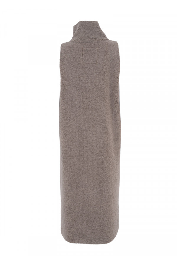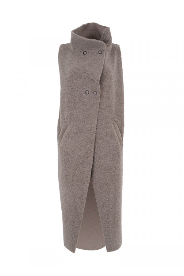 Opis: Dugačak ženski prsluk u svetlo braon boji sa asimetričnim preklopom, visokom kragnom i bočnim džepovima