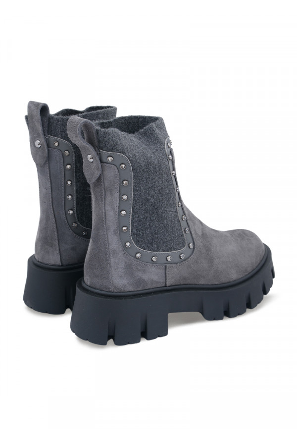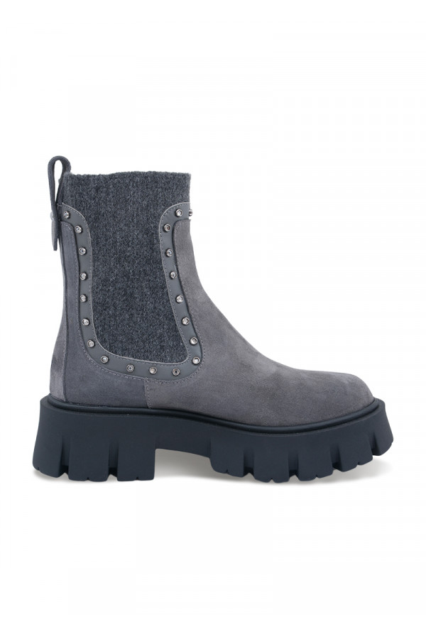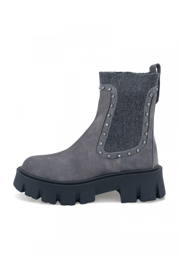 Opis: Kožne ženske čizme u sivoj boji s alastiš navlačenjem, nitnama i naglašenim đonom