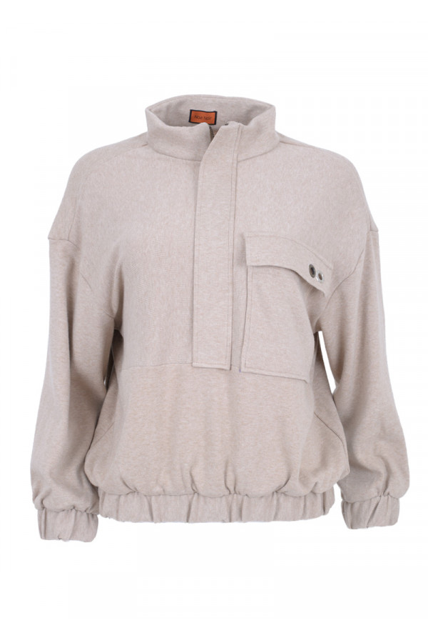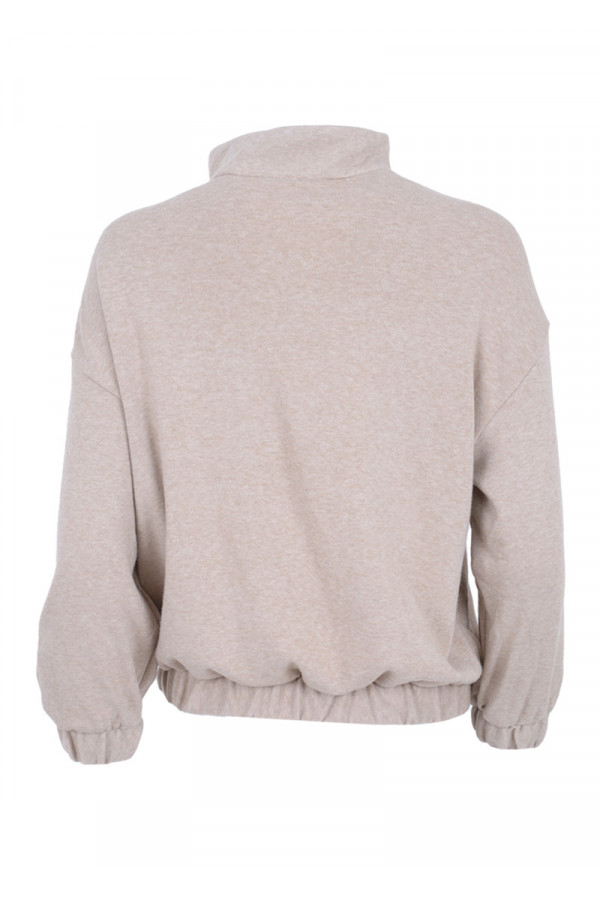 Opis: Ženski duks od mešavine viskoze u bež boji sa visokom zip kragnom, prednjim džepom i lastiš pojasom
