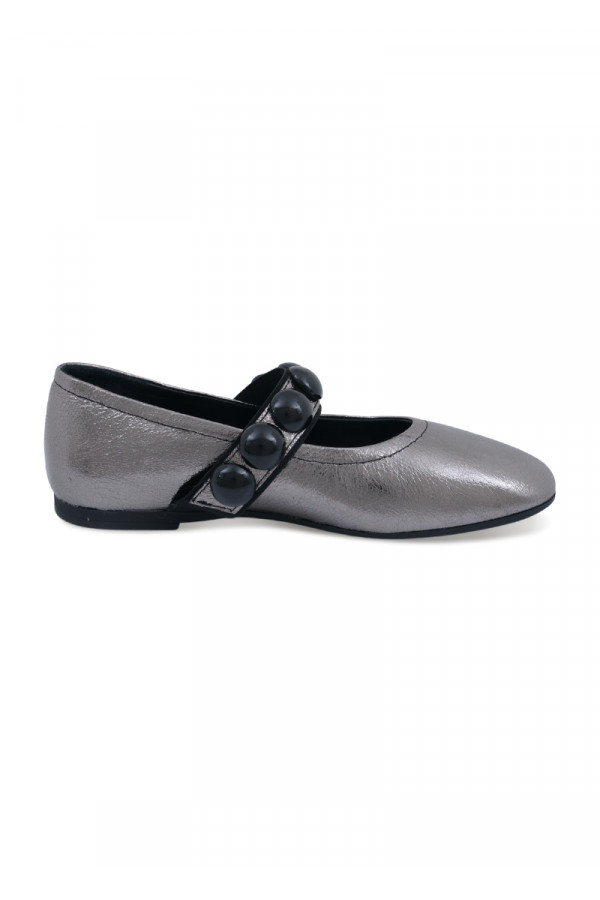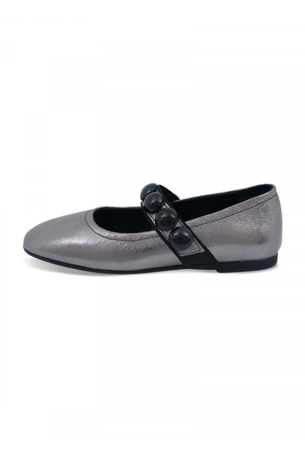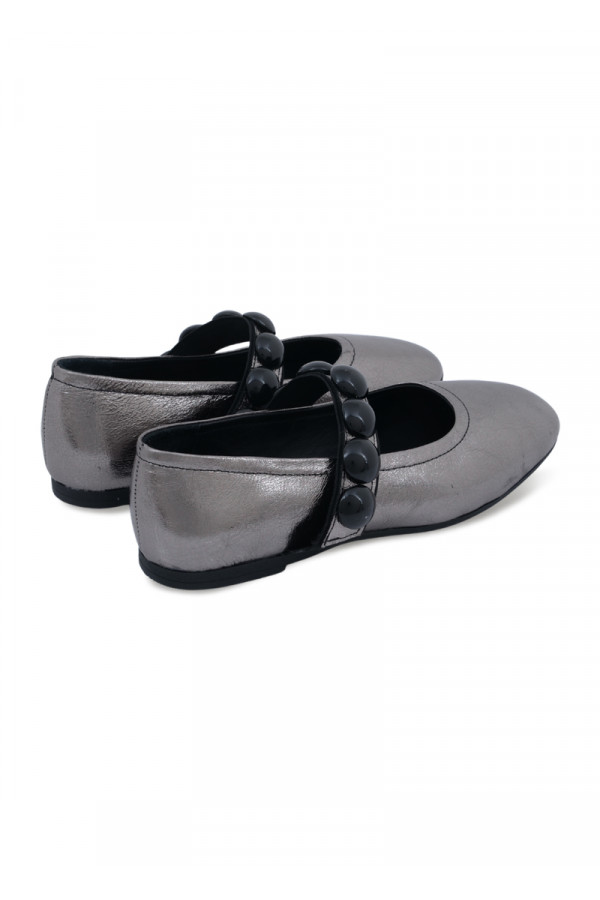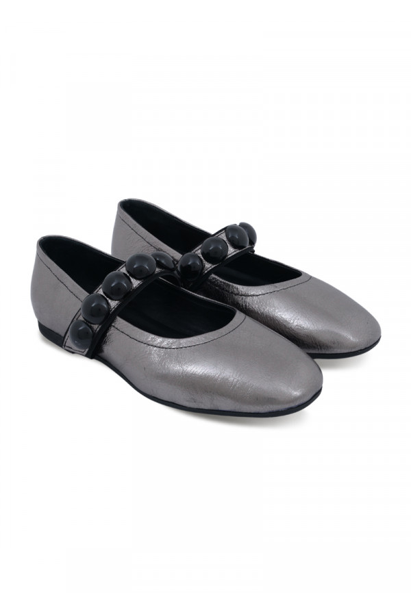 Opis: Kožne ženske baletnake u metalik antracit boji sa kaišem i crnim ukrasnim detaljima