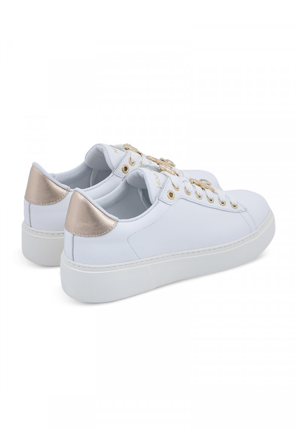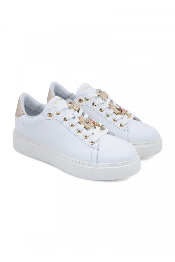 Opis: Kožne ženske patike u beloj boji sa izdignutim đonom i zlatnim detaljima