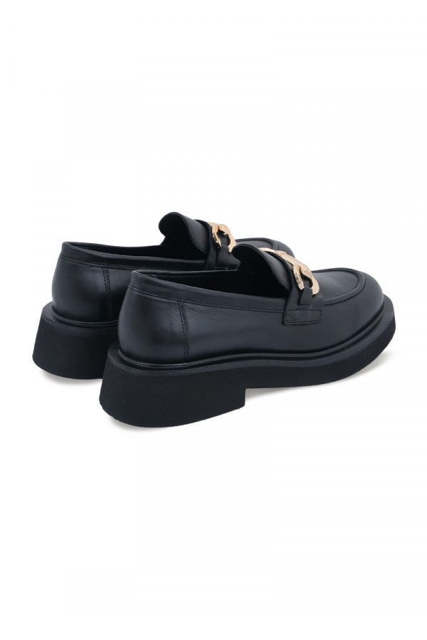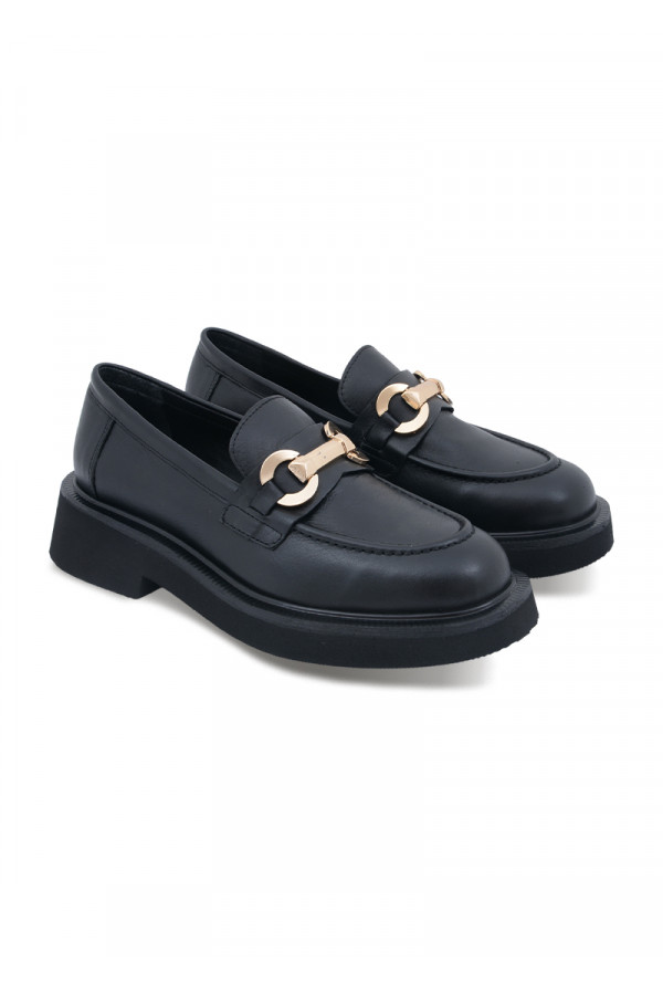Opis: Kožne ženske ravne cipele u crnoj boji sa dekorativnom metalnom šnalom