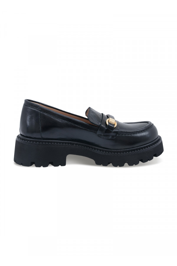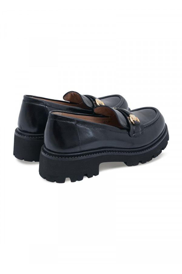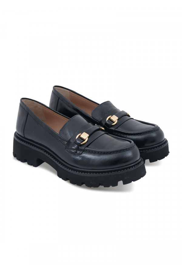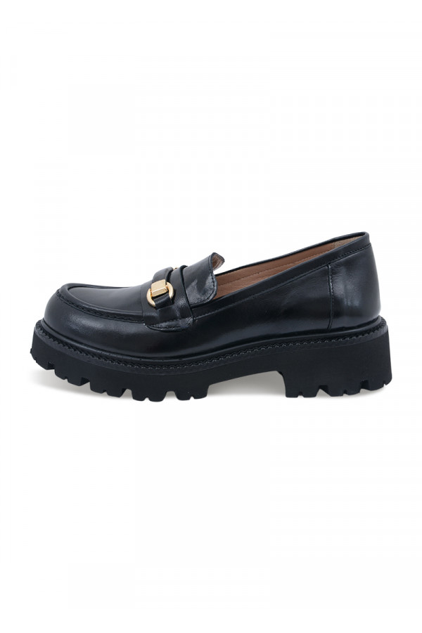 Opis: Kožne ženske ravne cipele u crnoj boji sa metalnom šnalom i naglašenim đonom