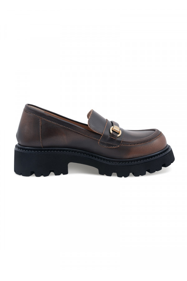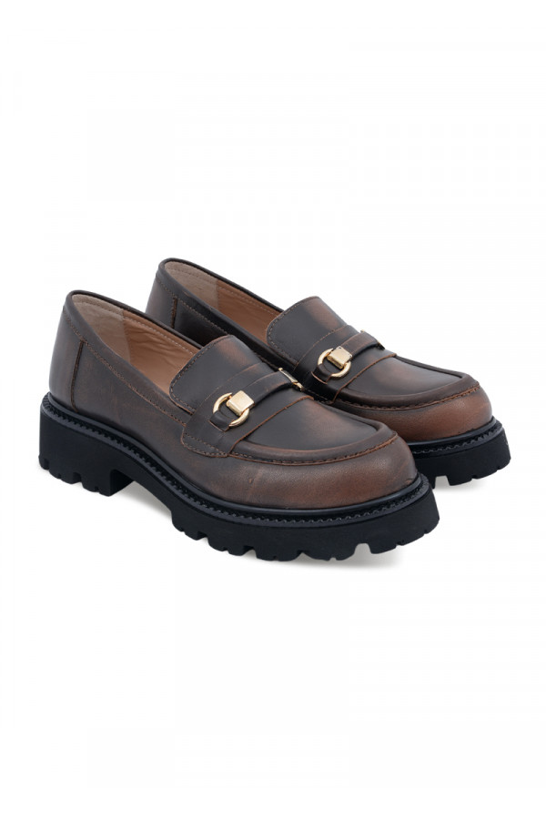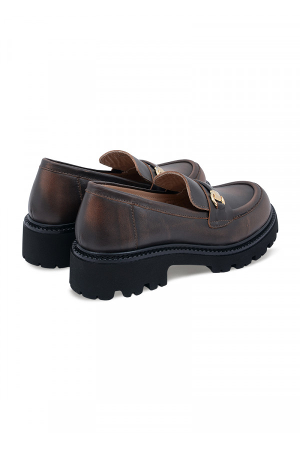 Opis: Kožne ženske ravne cipele u boji bronze sa metalnom šnalom i izdignutim đonom