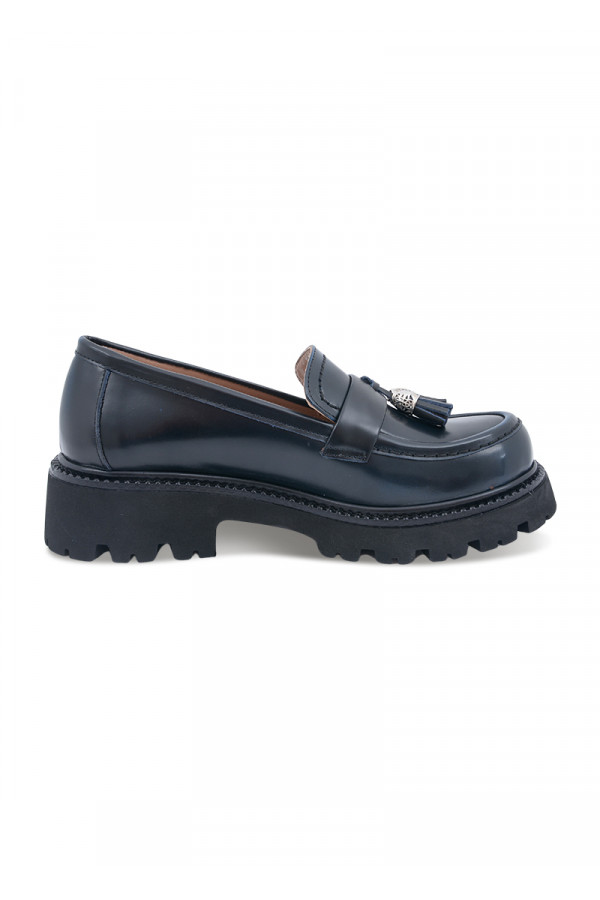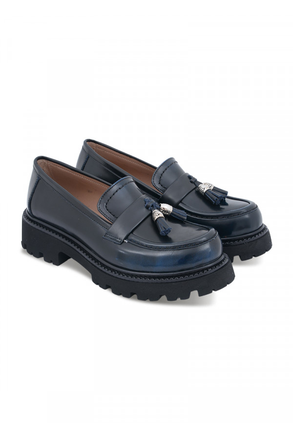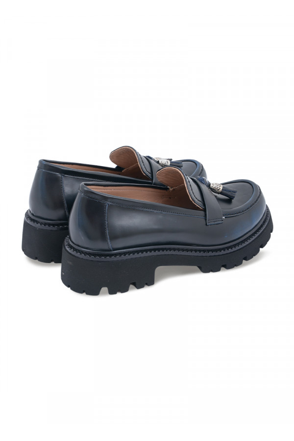 Opis: Kožne ženske ravne cipele u teget boji sa resama i naglašenim đonom