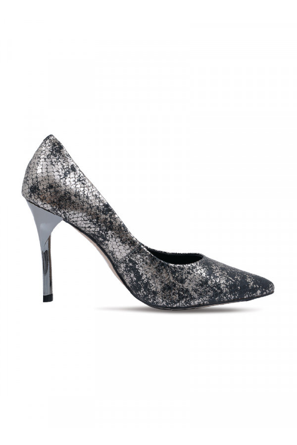 Opis: Elegantne ženske cipele od kroko kože u crnoj boji sa srebrnim detaljima, špicastim vrhom i visokom potpeticom