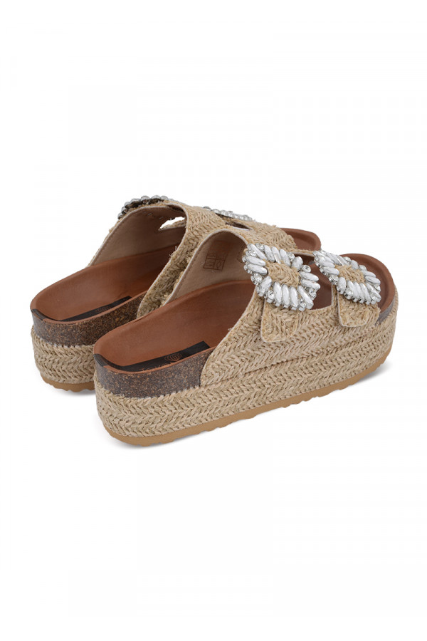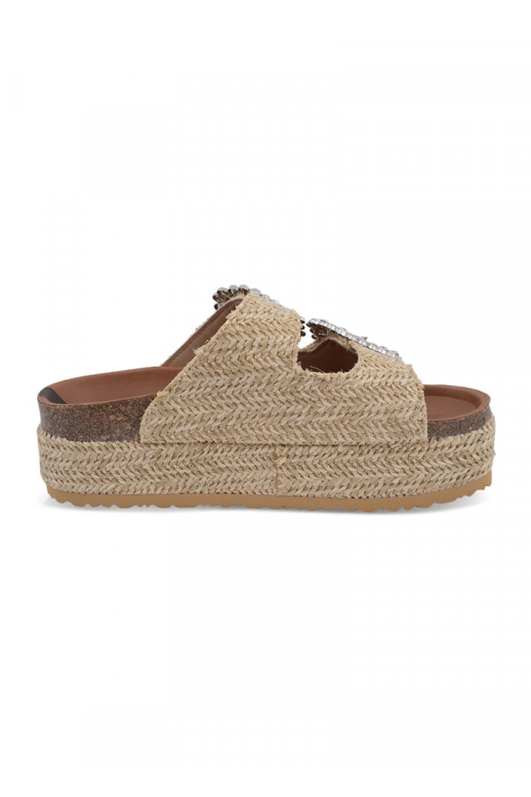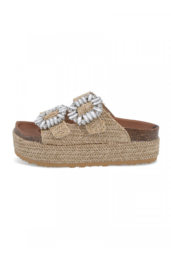 Sastav:Unutrašnjost: TekstilGazište: KožaĐon: EVA (penasta supstanca koja daje mekoću)Opis: Ženske ravne papuče u bež boji sa izdignutim platforma đonom sa dekorativnim kristalima